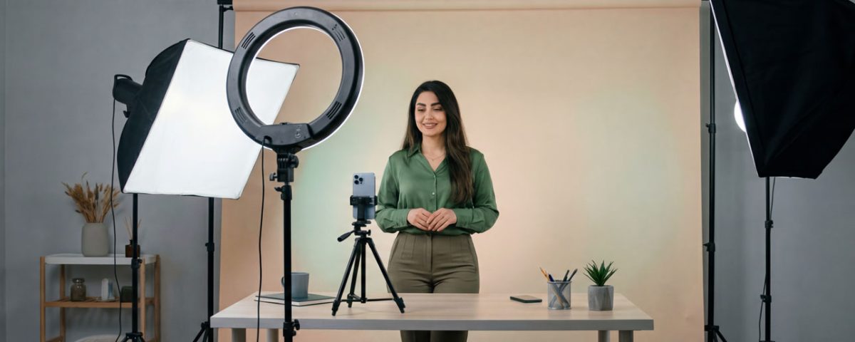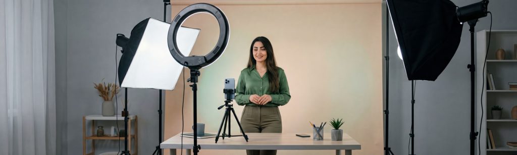 میخواهی بدانی چطور با کمترین هزینه اقدام به ساخت استودیو خانگی ارزان کنی؟ برای شروع فقط به یک نور مناسب (رینگ لایت یا نور ثابت LED)، یک بکگراند تمیز و چیدمان ۴۵ درجه نور نیاز داری؛ همین سه مورد میتواند کیفیت تصویرت را چند برابر کند، حتی اگر با موبایل فیلمبرداری کنی.